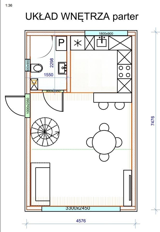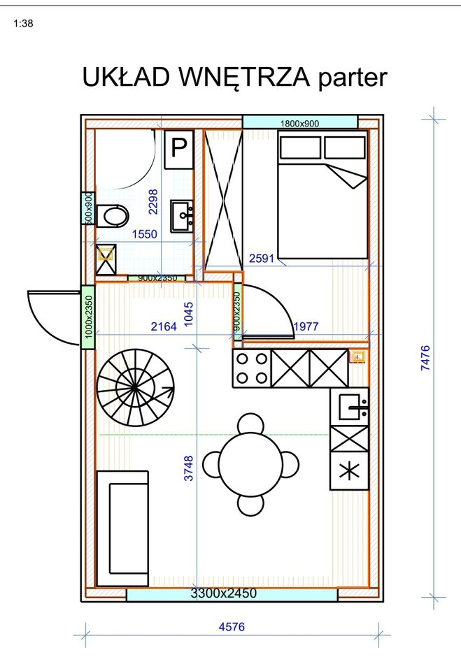 Wymiary zewnętrzne domku 5x7 m, wys. zewnętrzna 3,5 m, wys. wewnątrz pomieszczeń 2,6 m