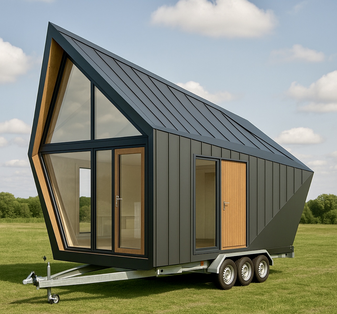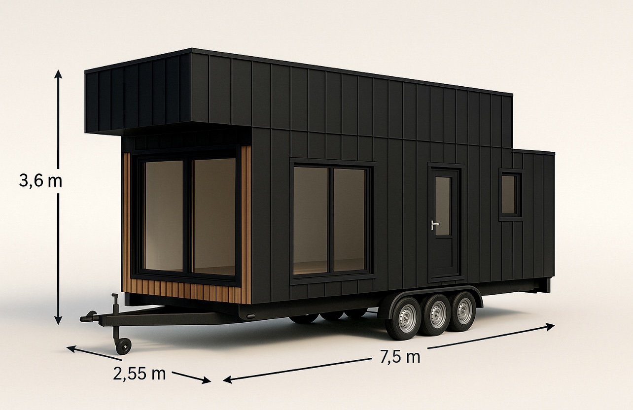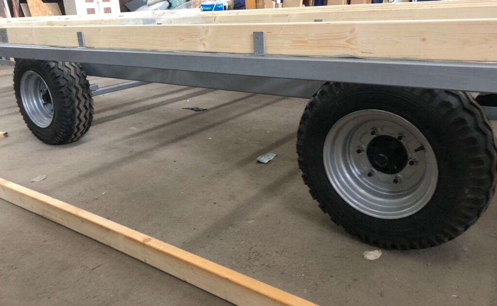 Stalowa rama, która jest podstawą domu, zawiera 4 duże koła, zapewniając mobilność i możliwość dowolnego ustawienia domu na działce.