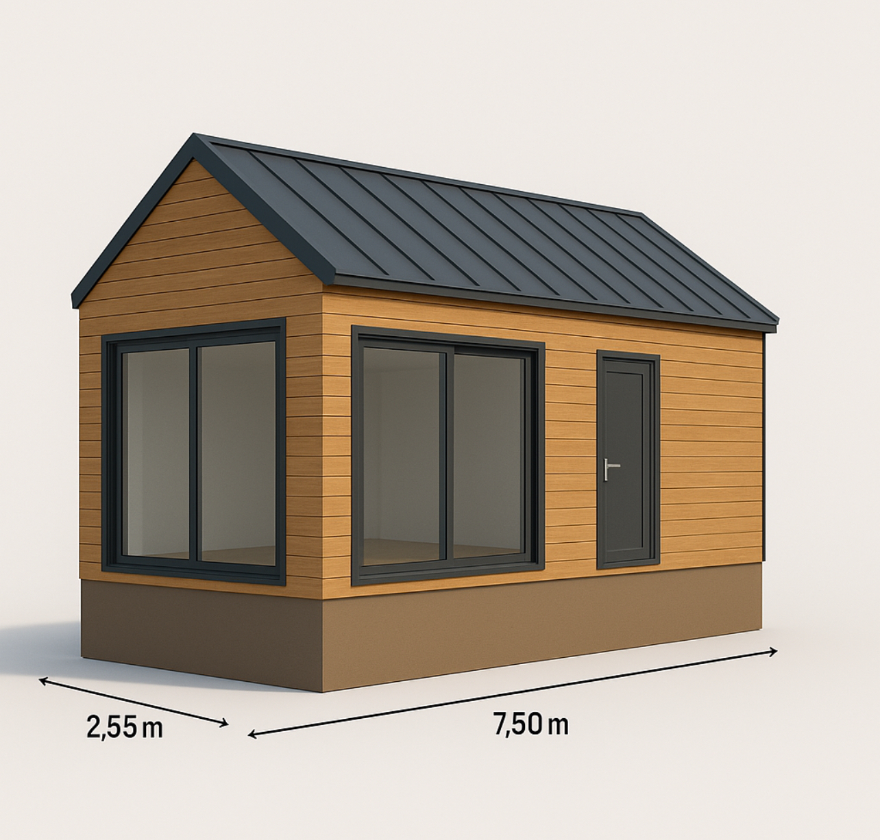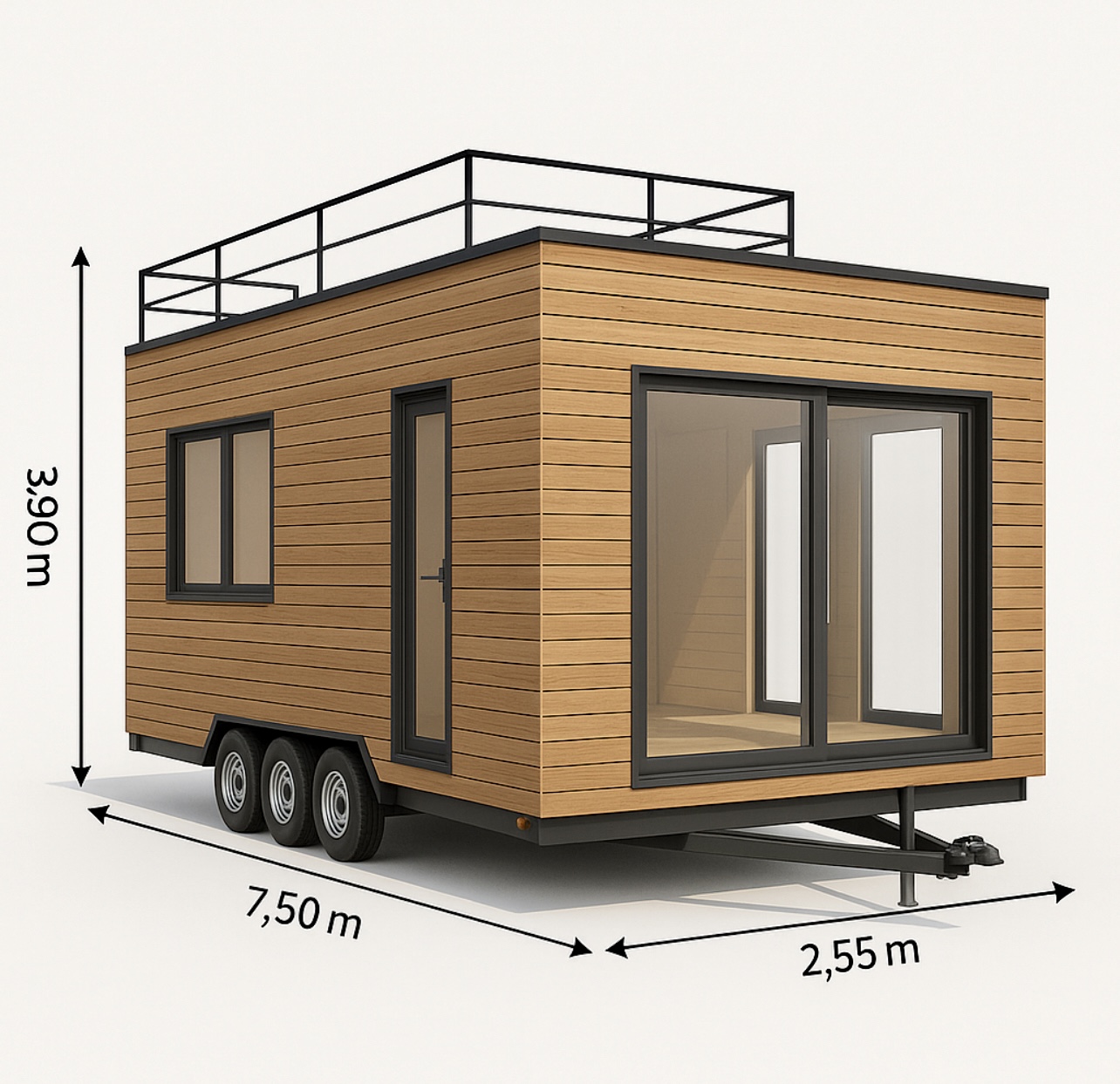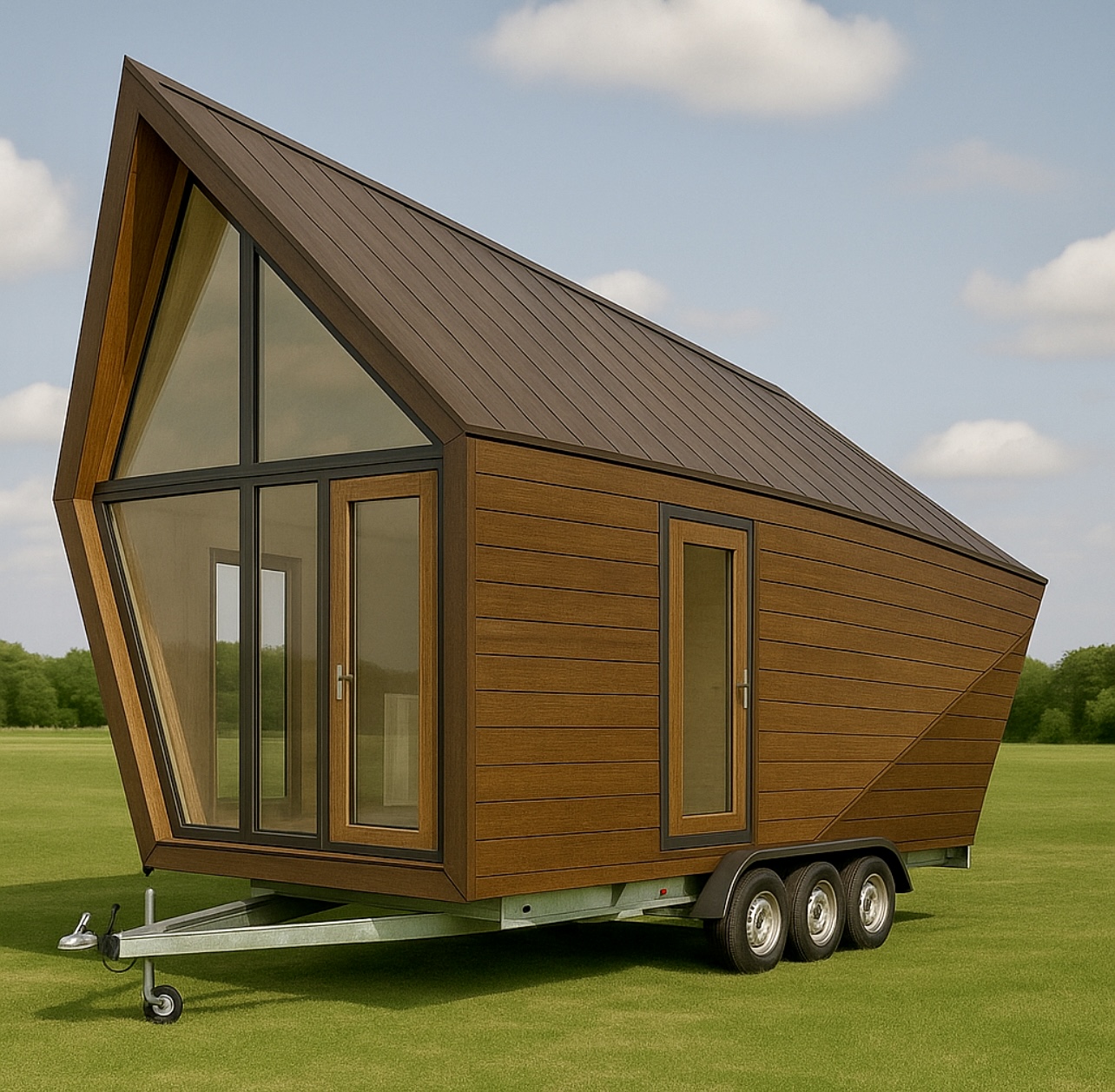 Stalowa rama, która jest podstawą domu, zawiera 4 duże koła, zapewniając mobilność i możliwość dowolnego ustawienia domu na działce.